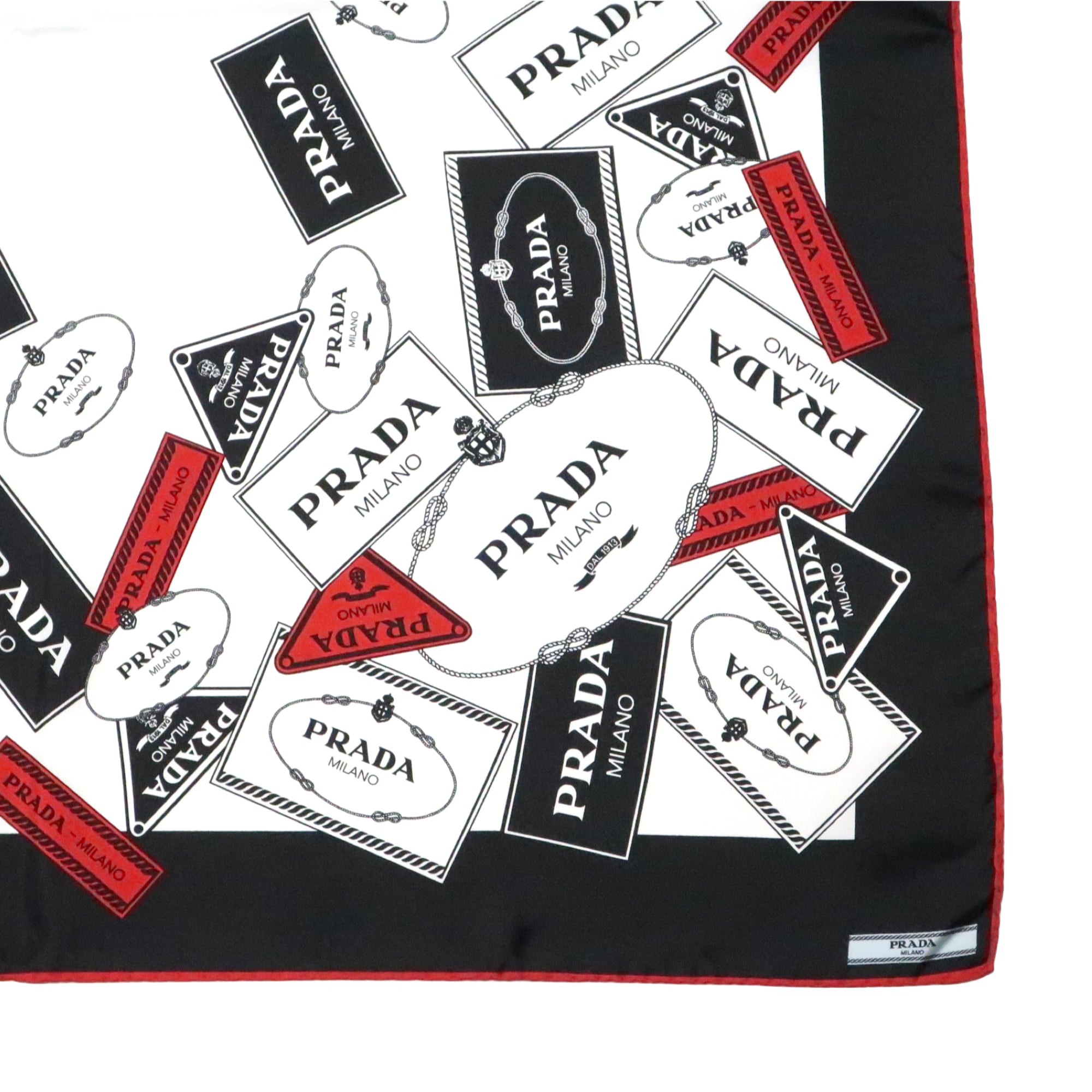 プラダ PRADA/スカーフ カレ90 トライアングルロゴ ブランドタグ ブラック ホワイト レッド プレート 大判 シルク【中古】【S227】