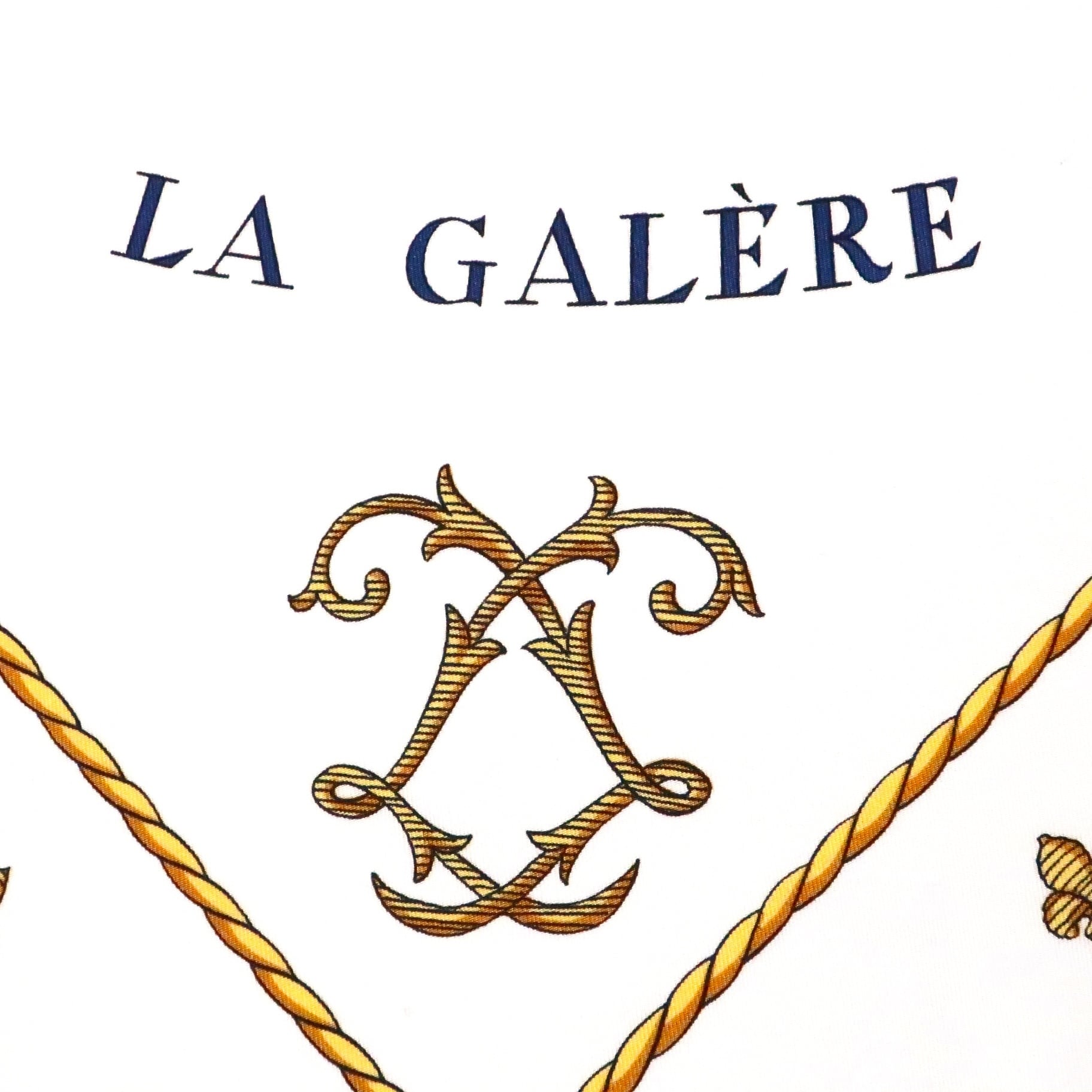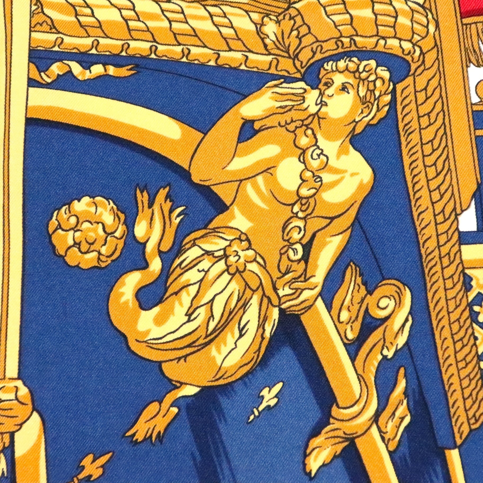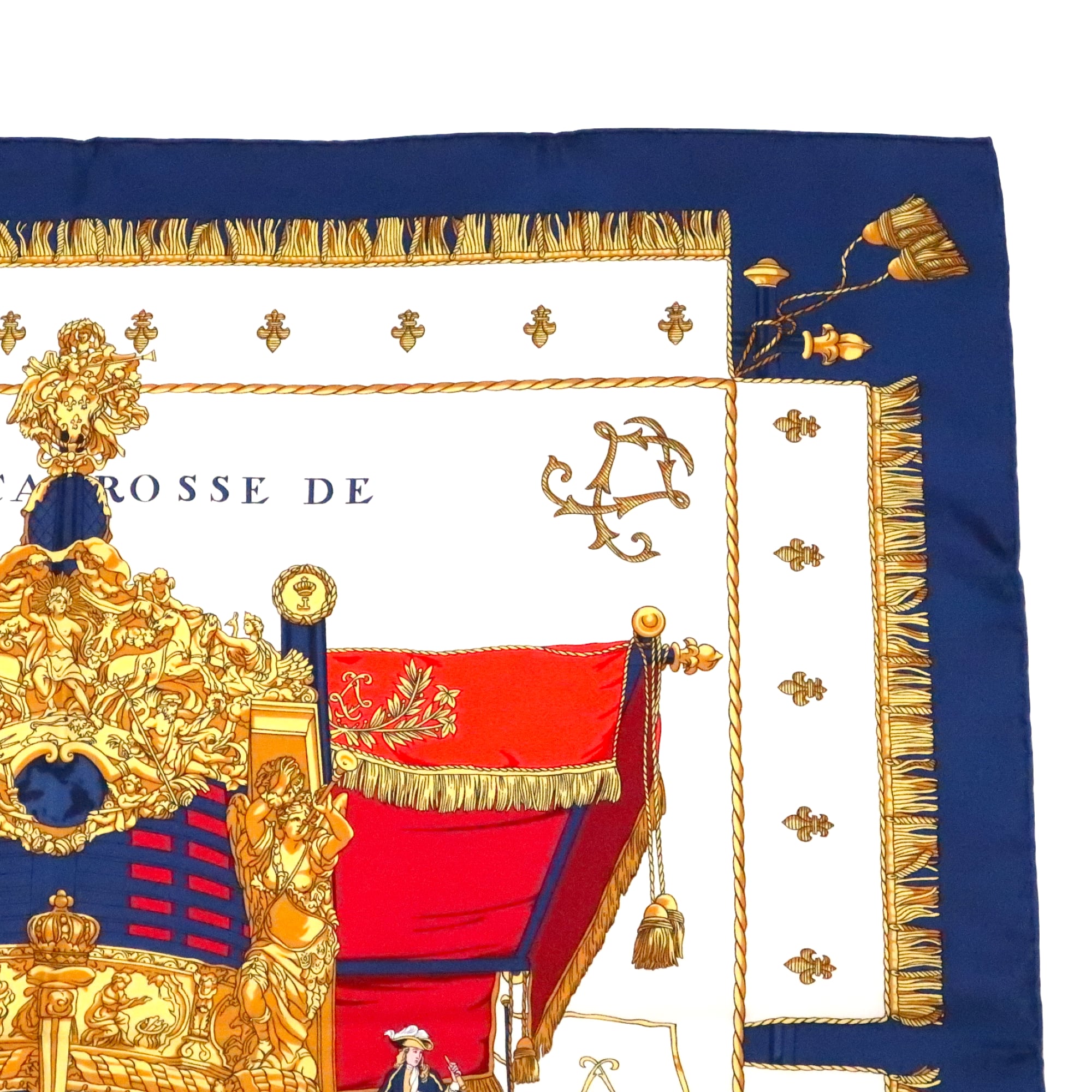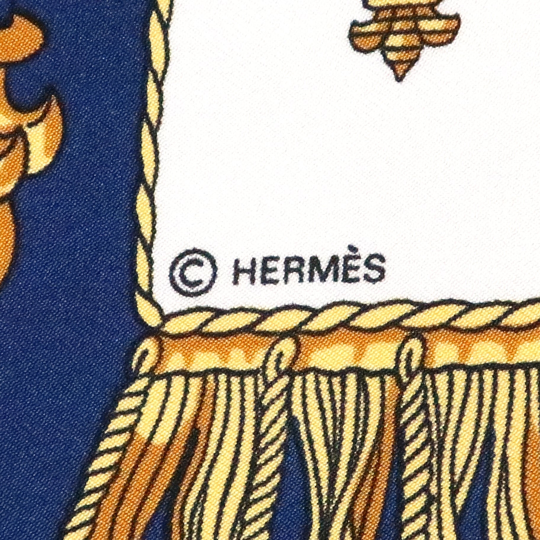 エルメス HERMES/スカーフ カレ90 クイーンの戴冠式 VUE DU CARROSSE DE LA GALERE LA REALE 大型帆船 馬車 ブルー ホワイト フランス タッセル 大判 シルク【中古】【S248】