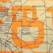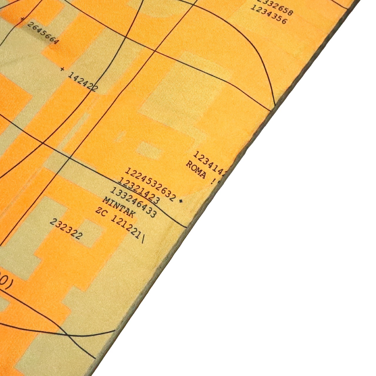 重なり合う円とブランドロゴの大判スカーフ。