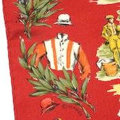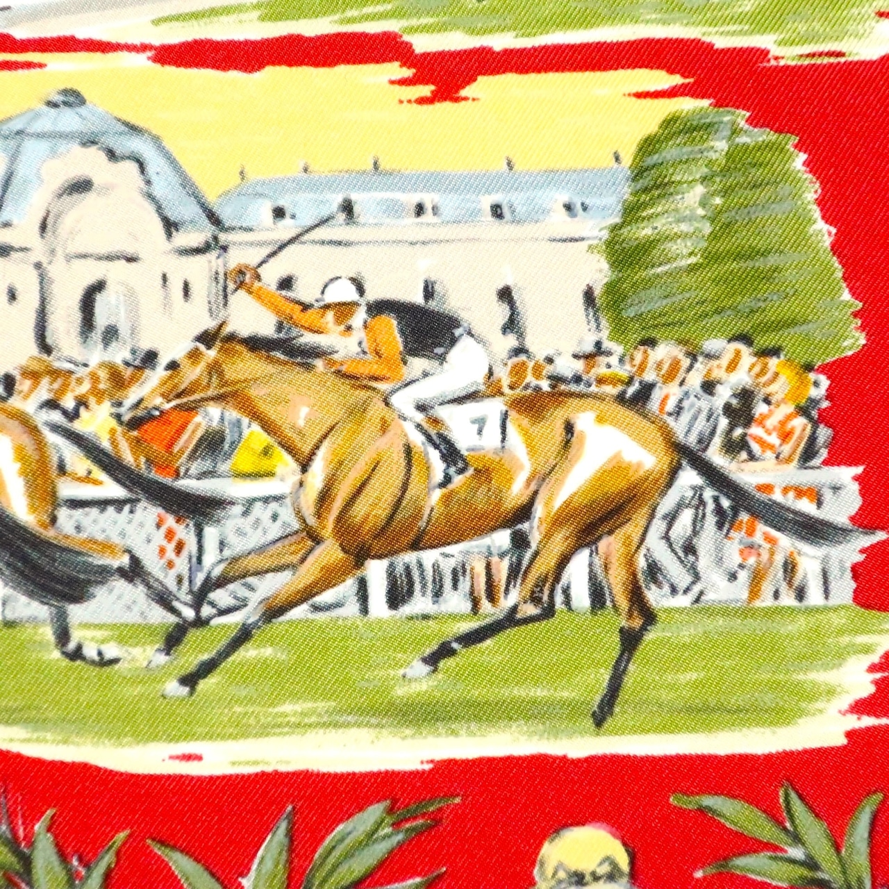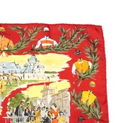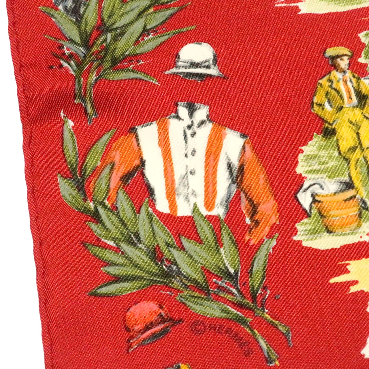 エルメス HERMES/スカーフ ガヴロッシュ シャンティイ競馬場 CHANTILLY 競馬 ユニフォーム レッド カラフル 人物 風景 シルク プチカレ【中古】【S257】