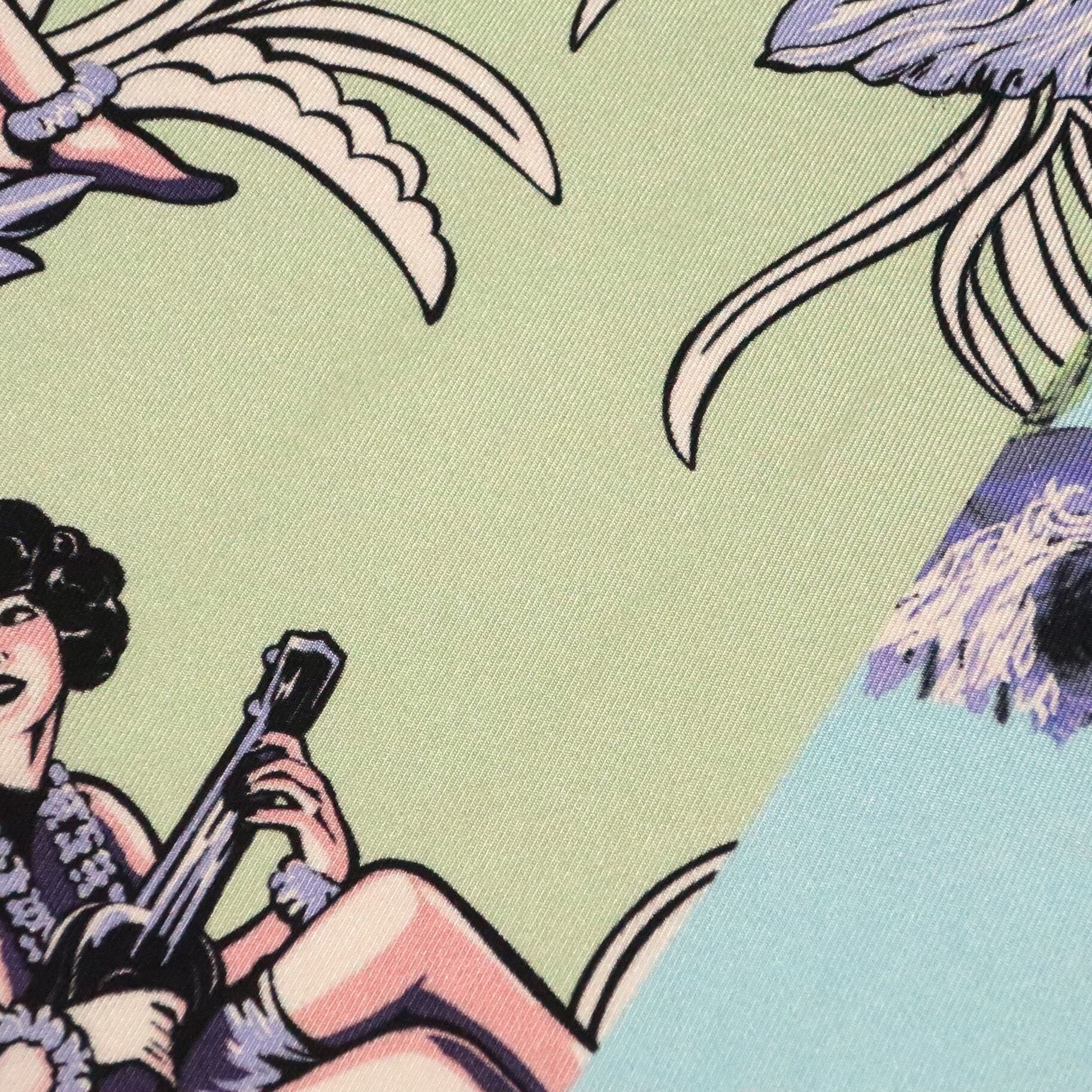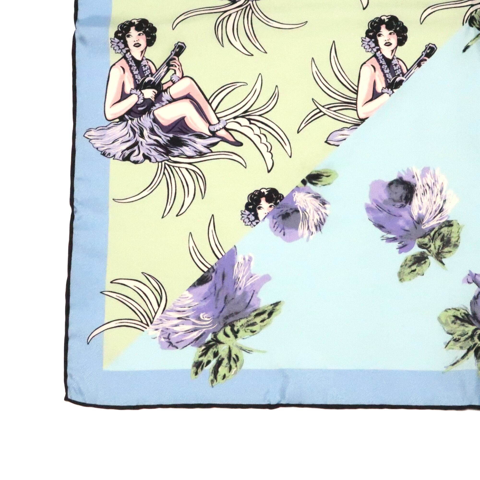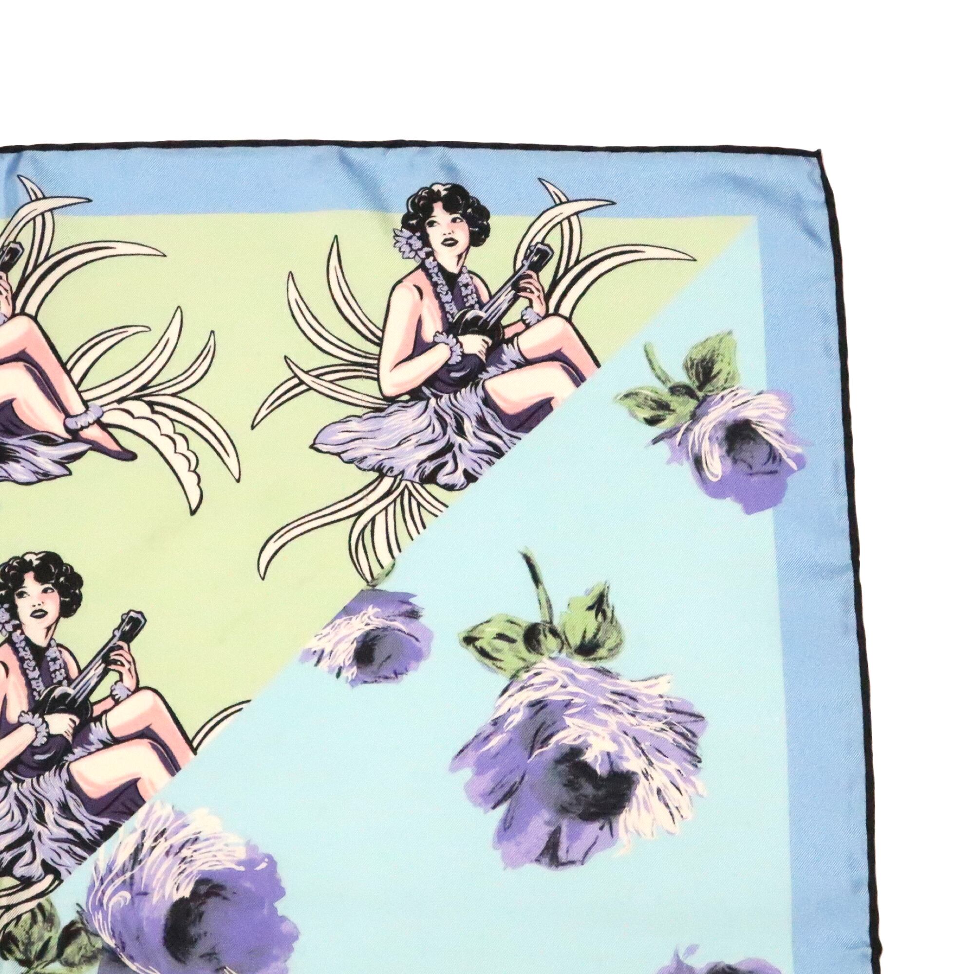 鮮やかなフラワーとウクレレを弾く女性のスカーフ。