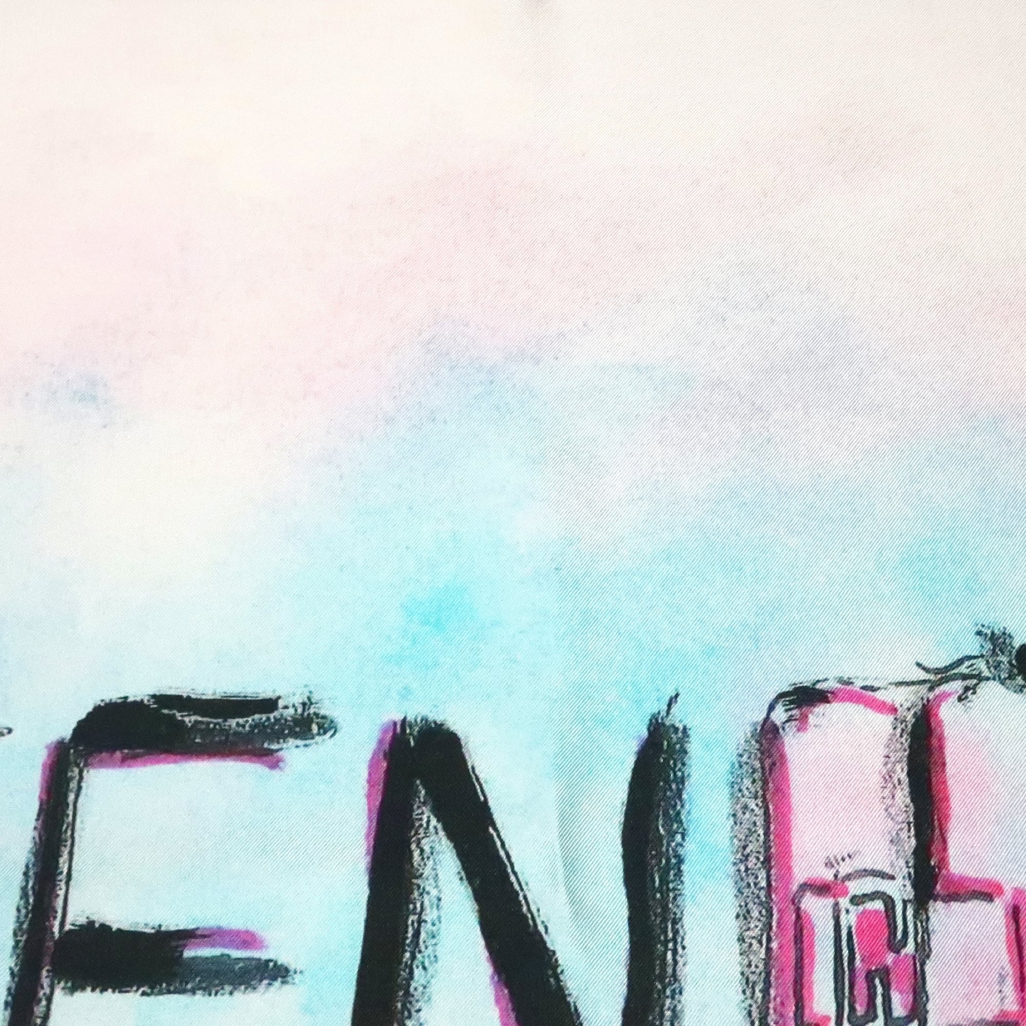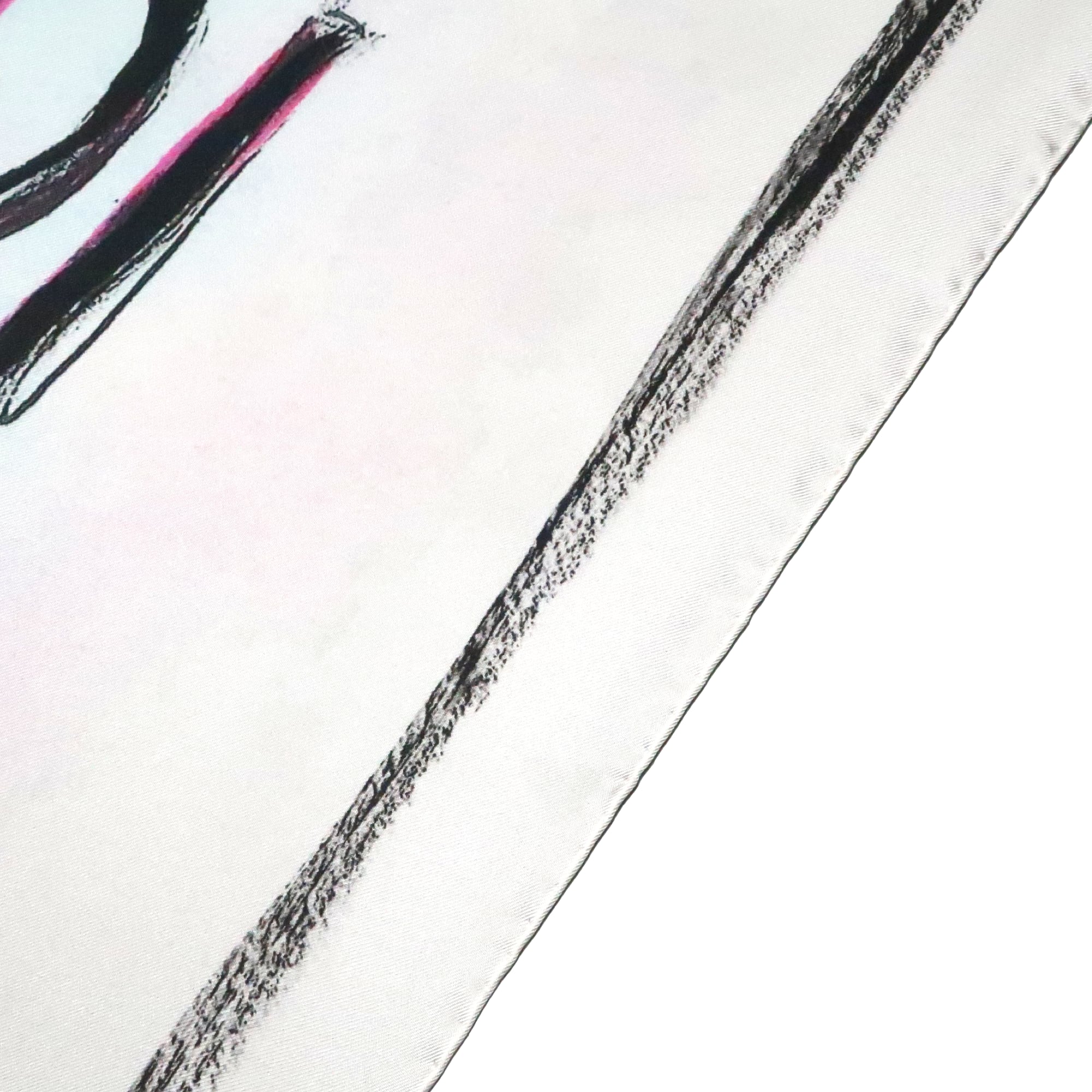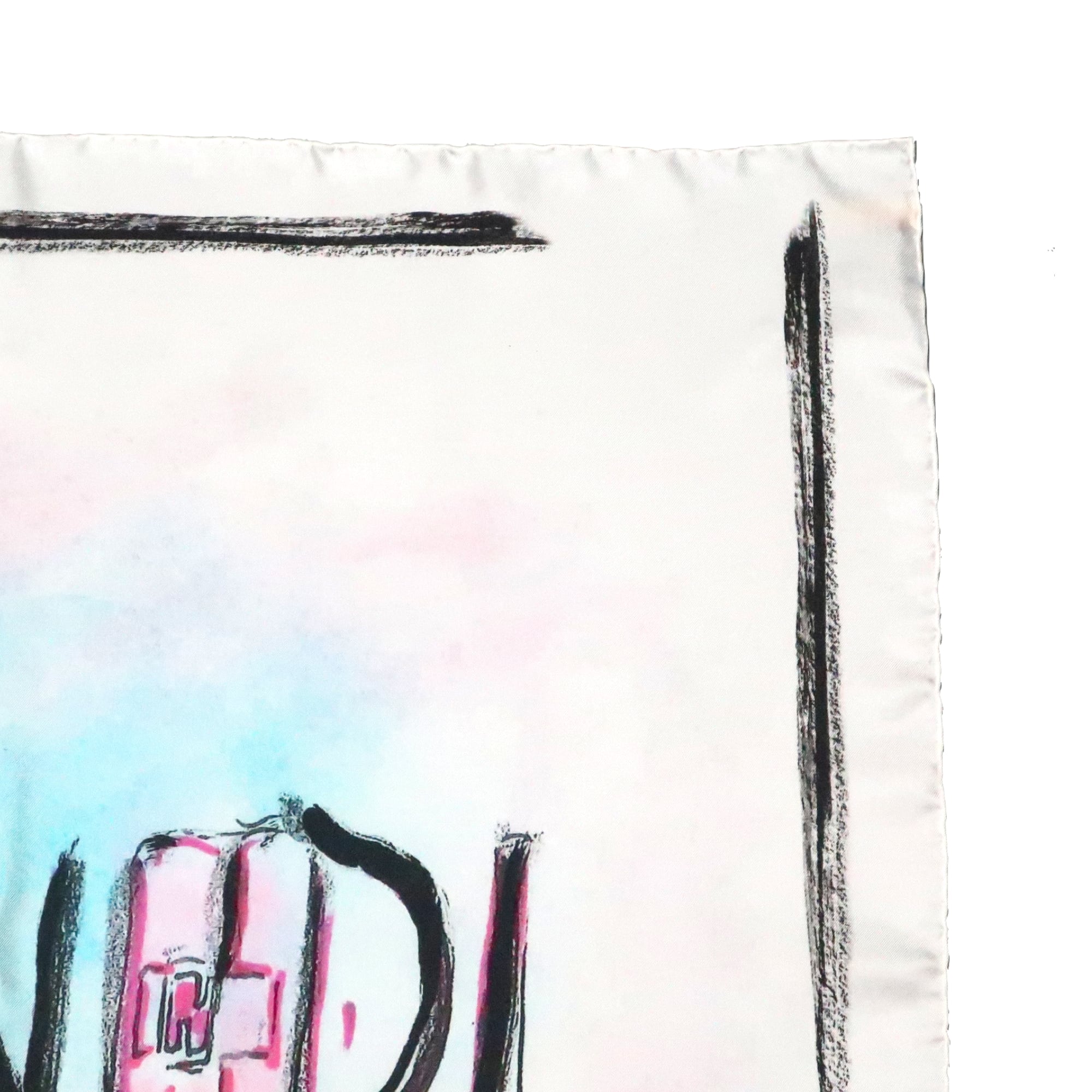 手書き文字が大きくプリントされたシルクスカーフ。