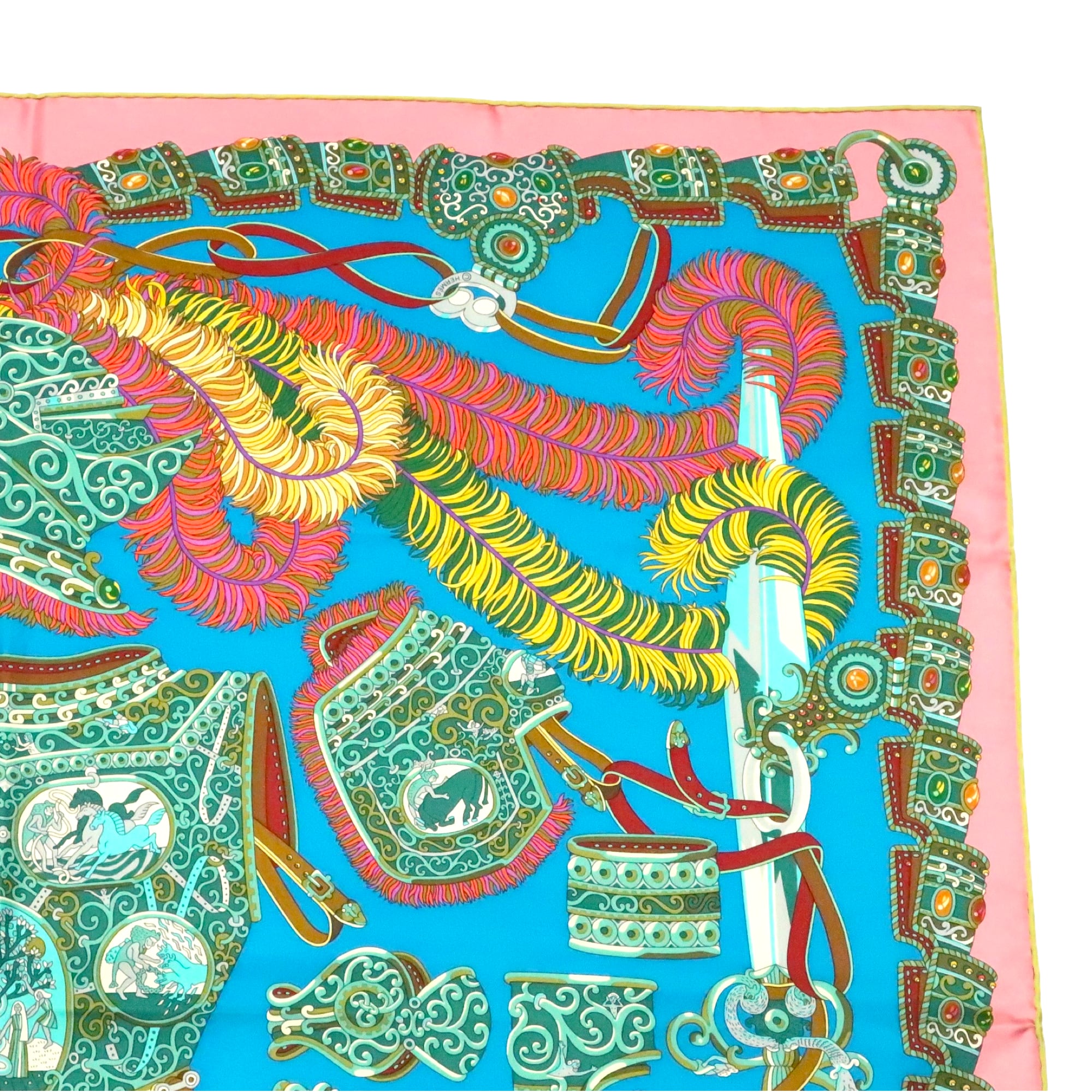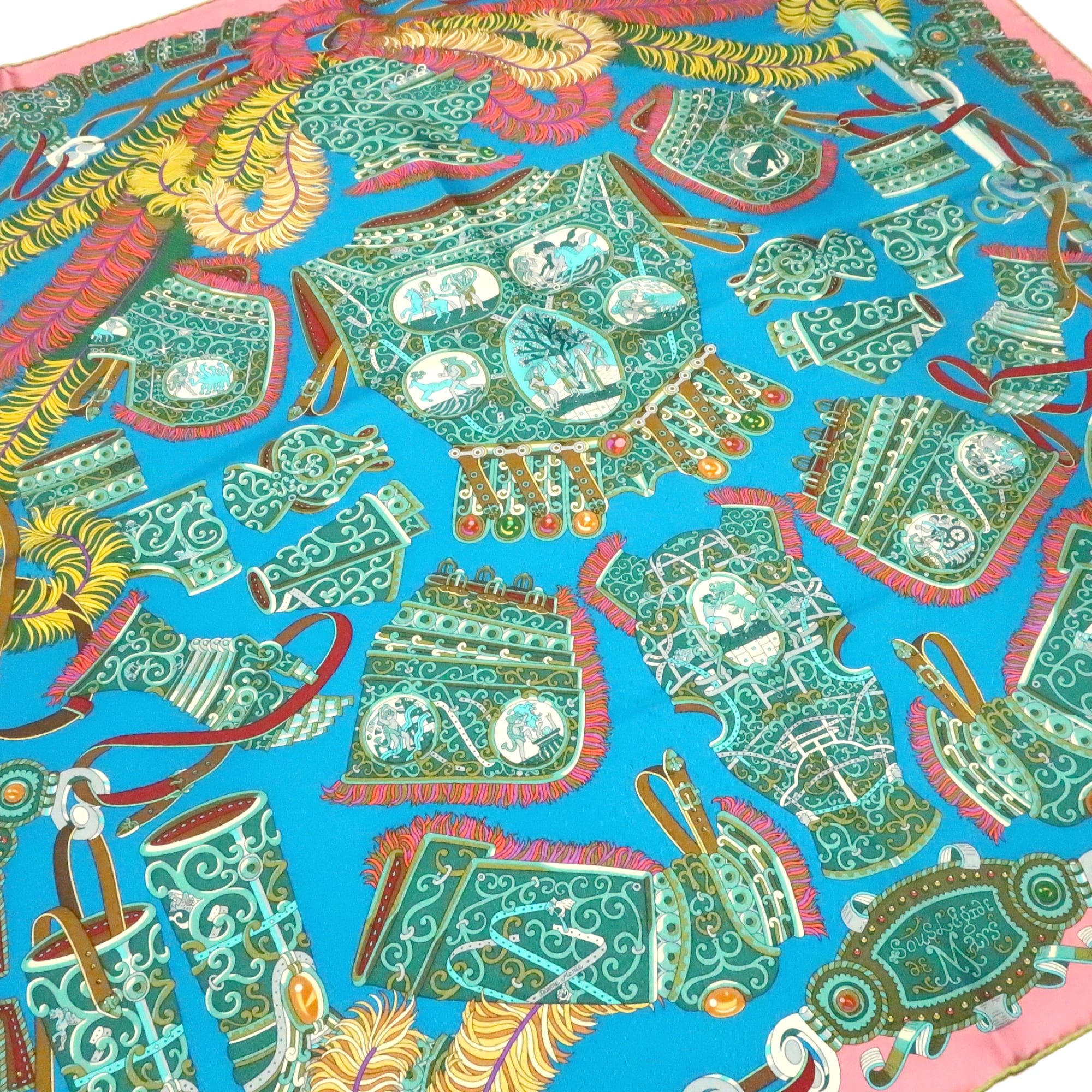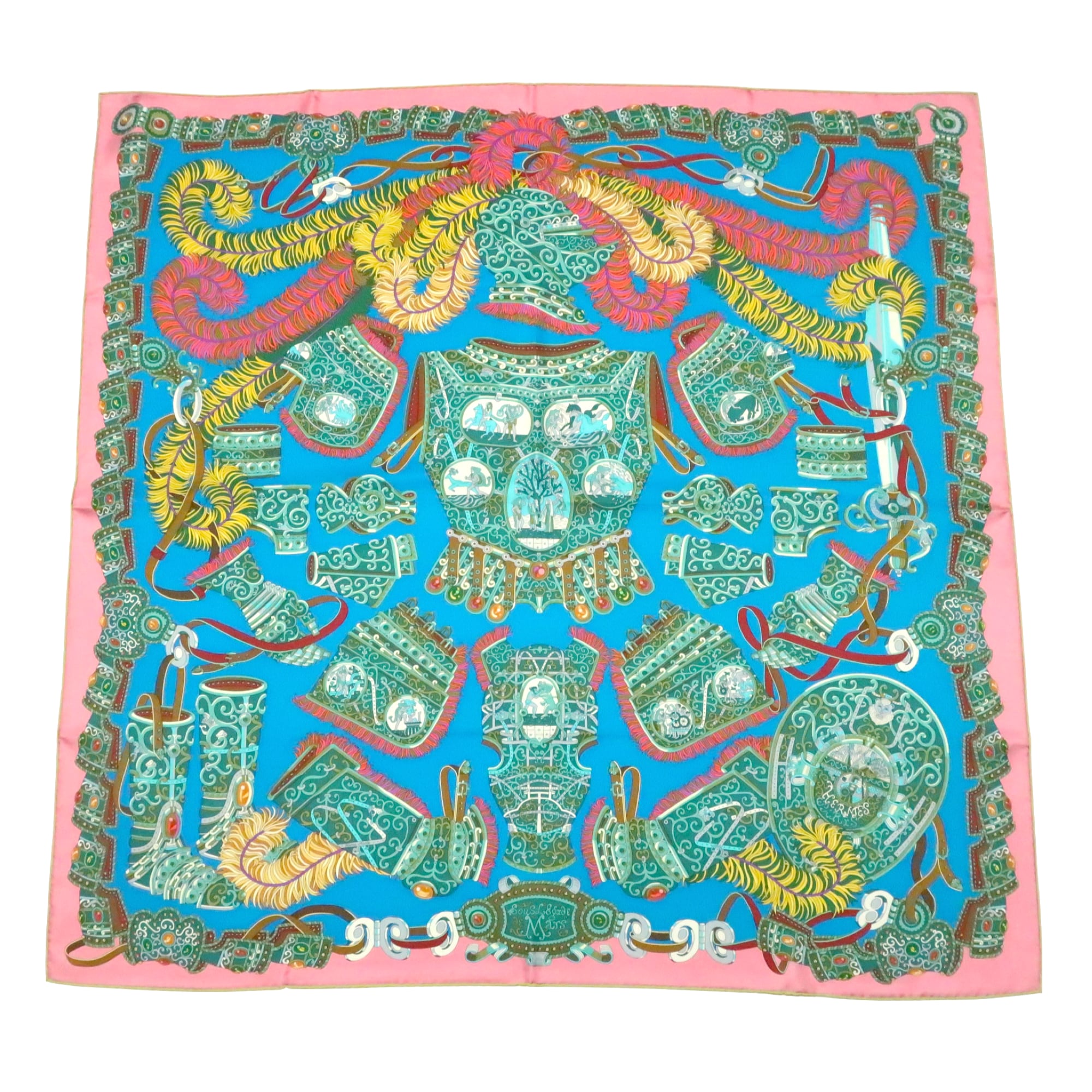 エルメス HERMES/スカーフ カレ90 軍神マルス SOUS LE GIDE DE MARS 甲冑 神話 ブルー ピンク ローマ 羽根飾り 大判 シルク【中古】【S270】