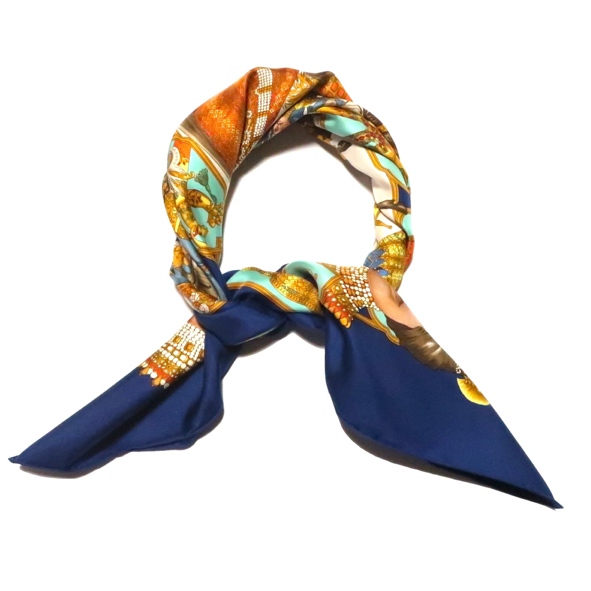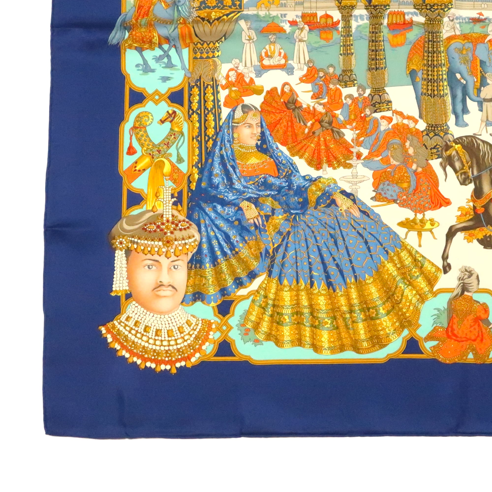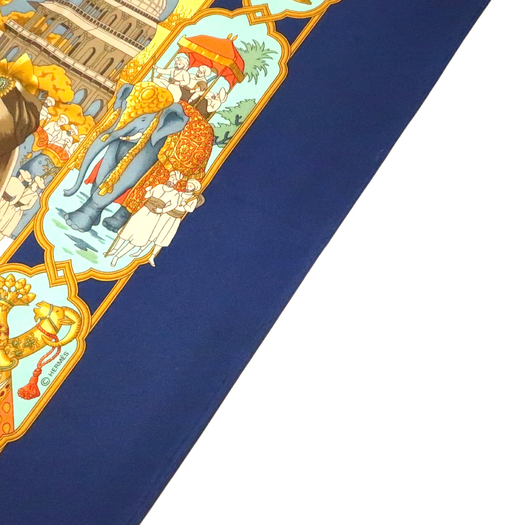 エルメス HERMES/スカーフ カレ90 マハラジャ MAHARAJAS インド 宮廷 ネイビー イエローゴールド 装飾 人々 大判 シルク【中古】【S239】