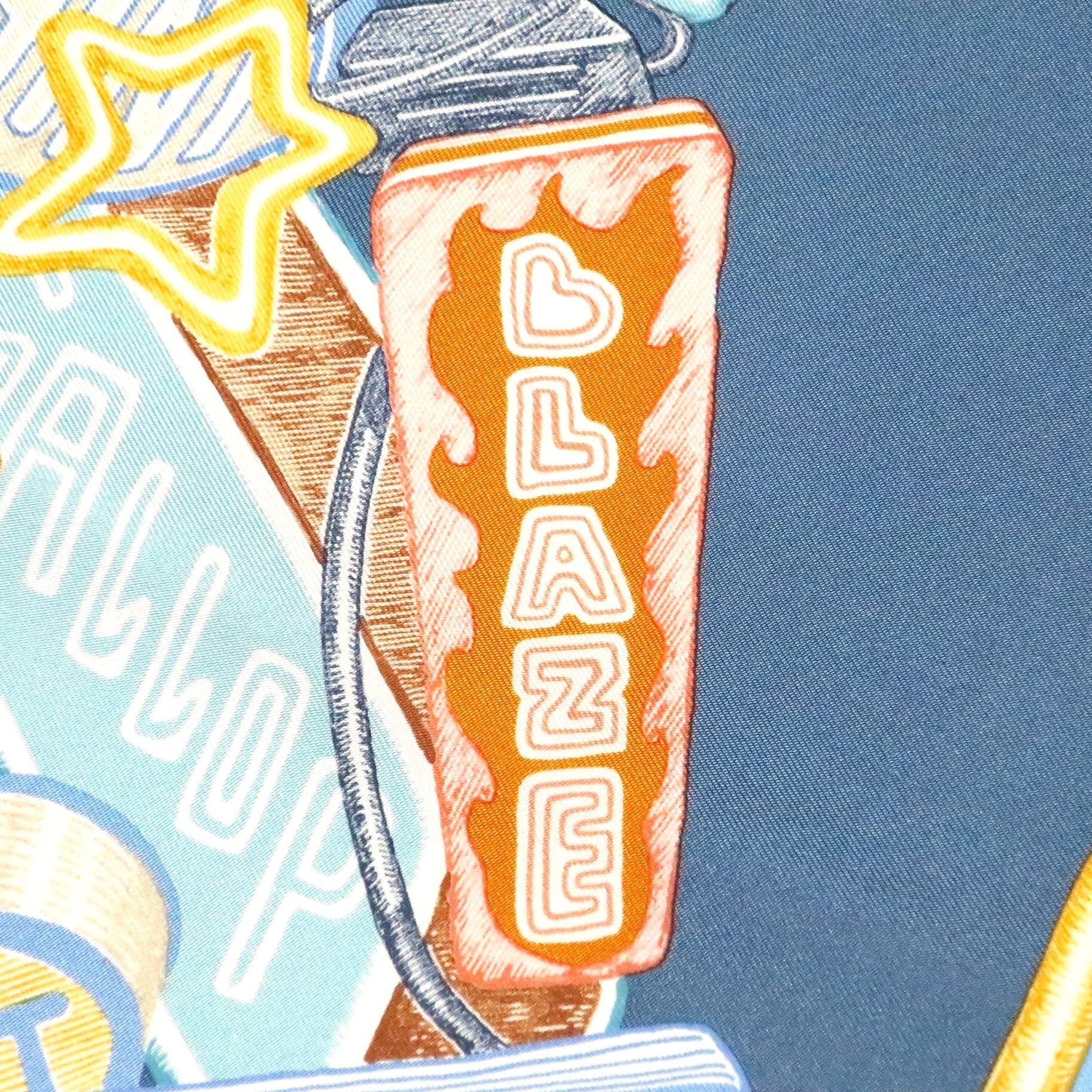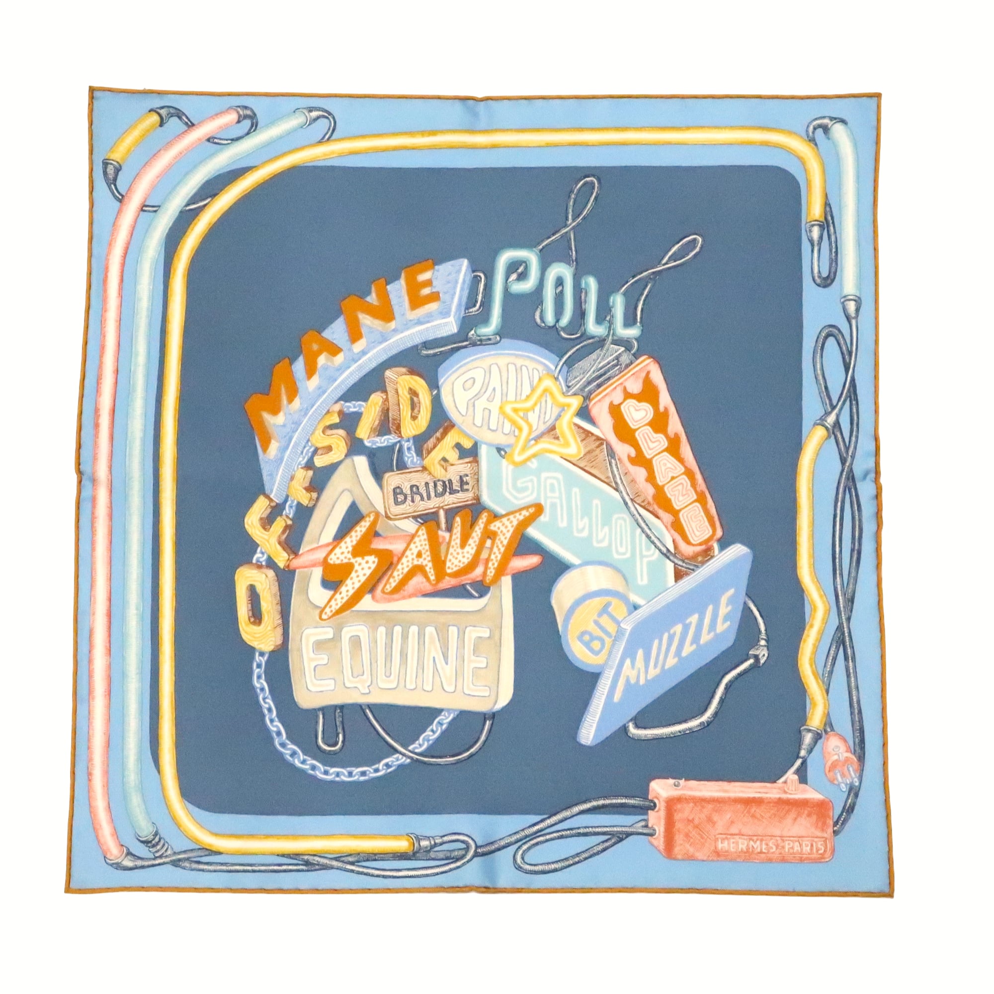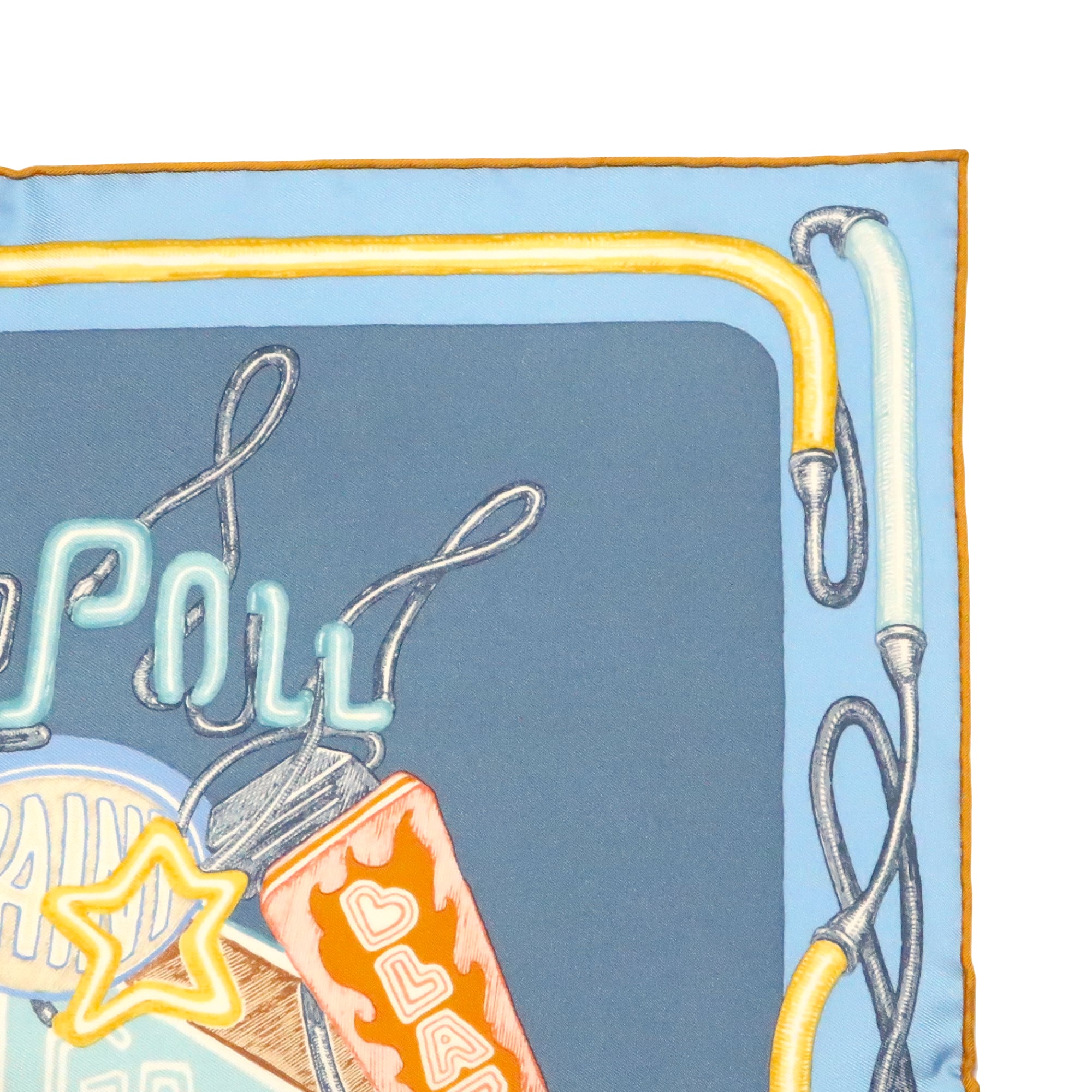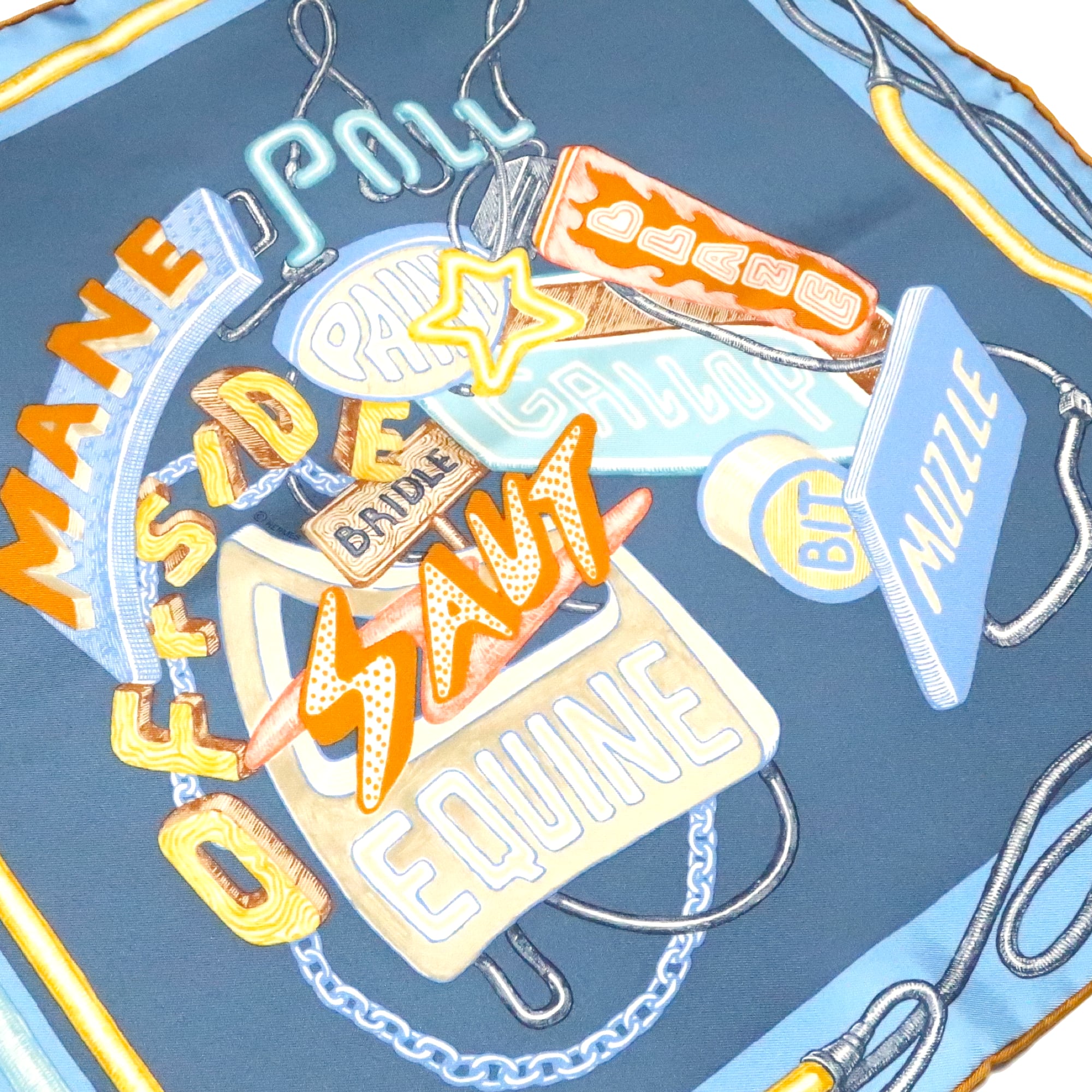 エルメス HERMES/スカーフ ガヴロッシュ シュヴァロスコープ・ネオン CHEVALOSCOPE NEON 馬 看板 ブルー スカイブルー ネオンサイン 電飾 シルク プチカレ【中古】【S277】