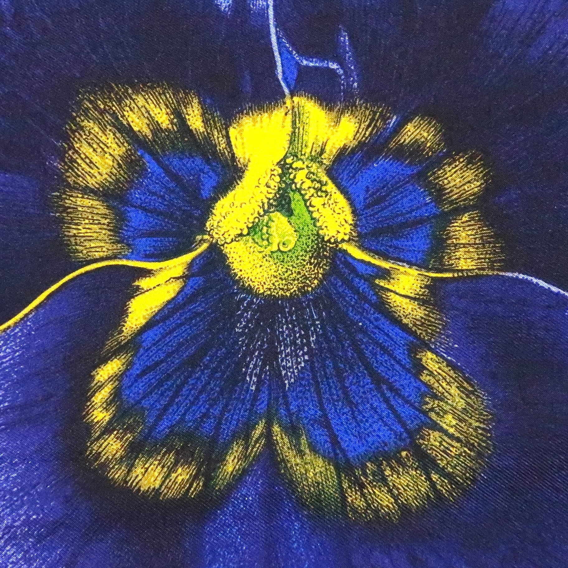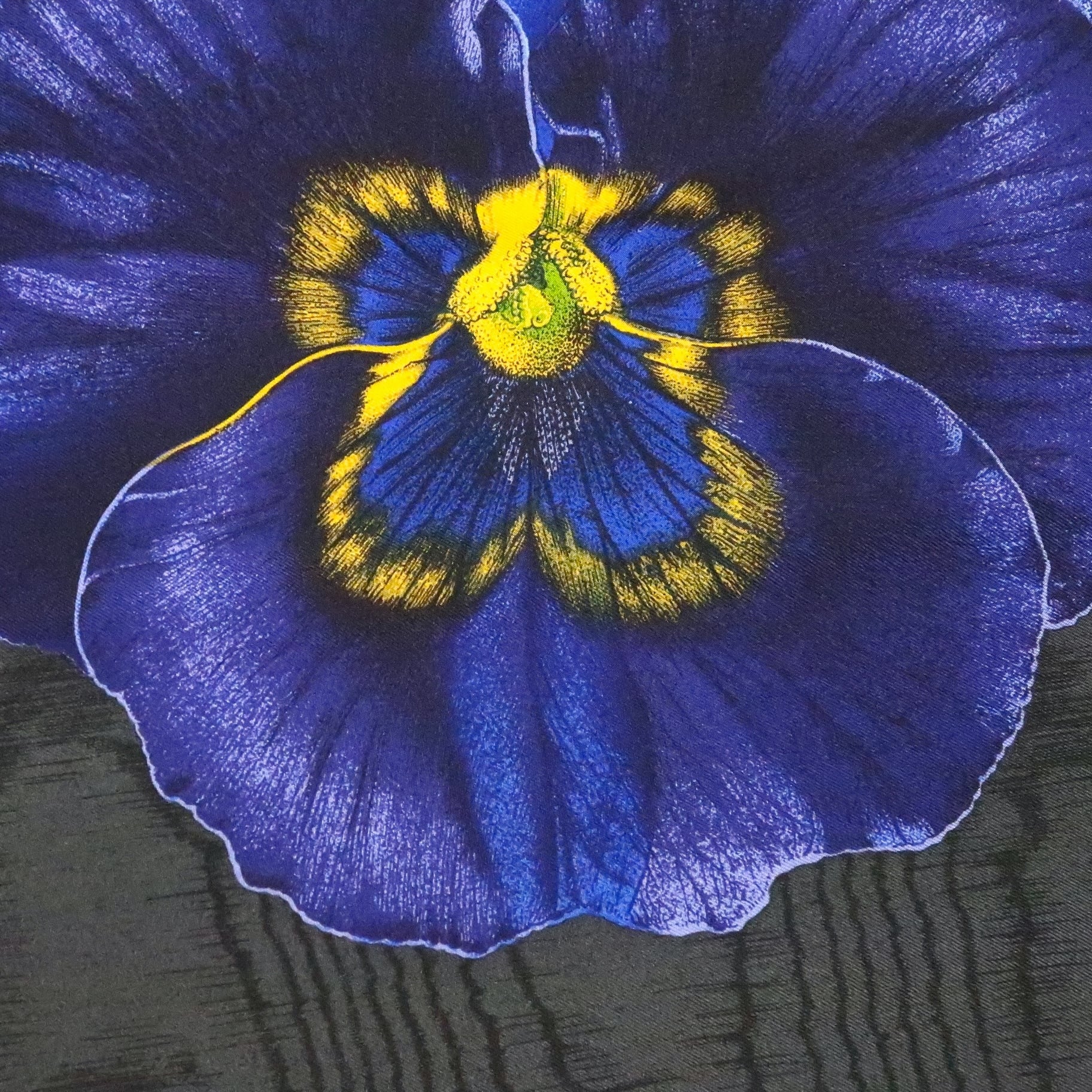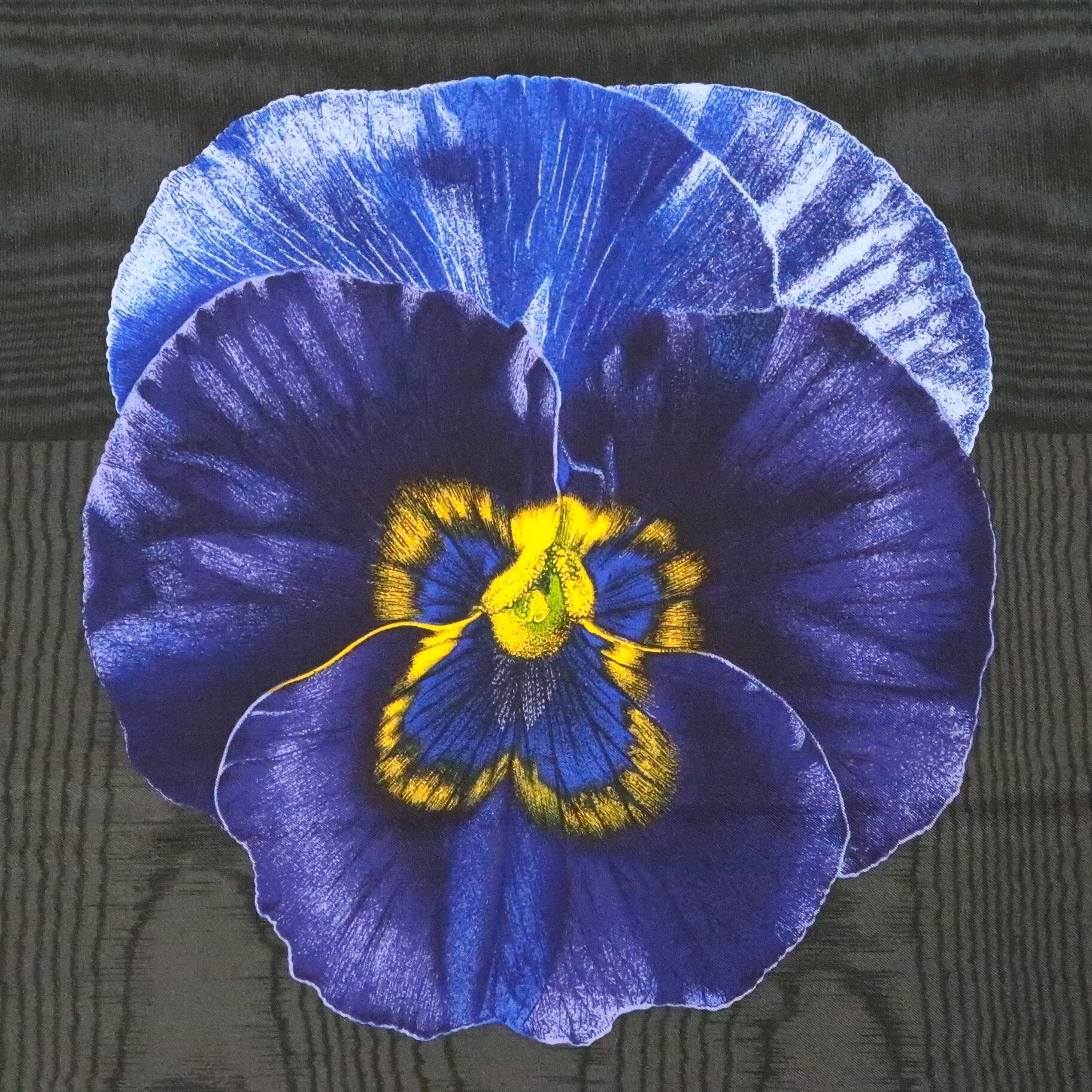 鮮やかなブルーのパンジー柄ミニスカーフ。
